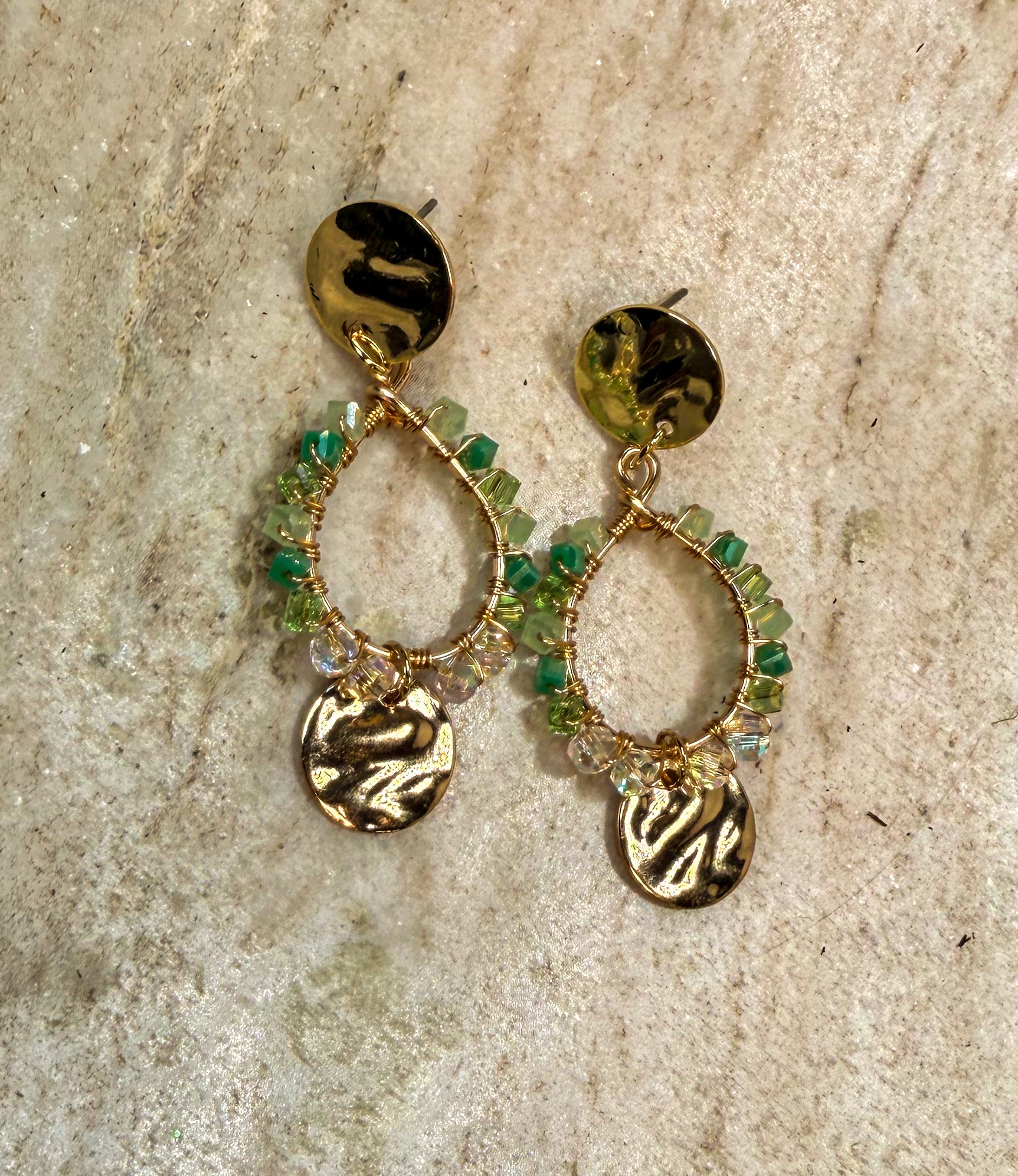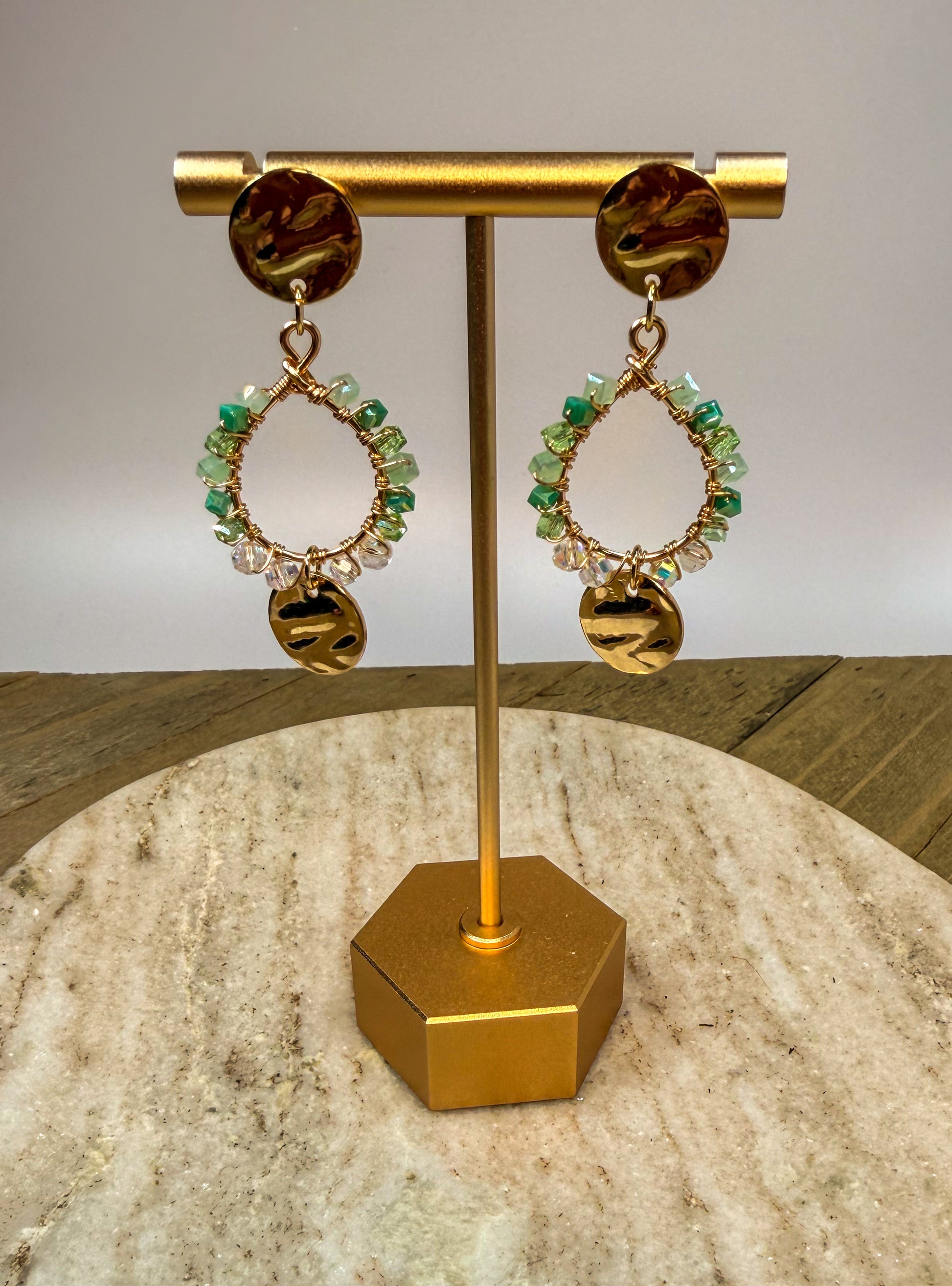 These elegant chandelier earrings feature a radiant blend of gold and green crystal, designed to catch the light with every movement. Faceted green crystals cascade gracefully from a warm gold-tone setting, creating a rich contrast that feels both luxurious and timeless. Delicate yet eye-catching, the chandelier silhouette adds a touch of drama while remaining refined. Perfect for evening events or special occasions, these earrings bring a hint of glamour and a fresh pop of color to any look.